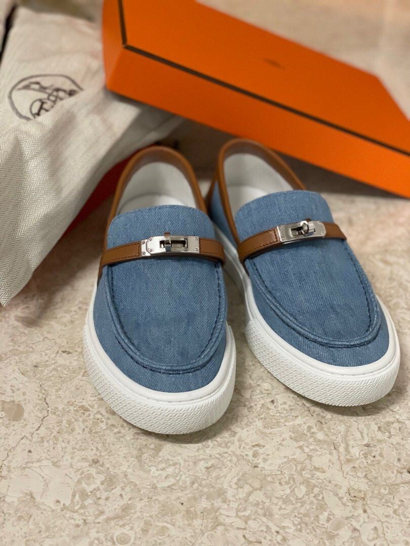HERMES Bleu Clair/Gold Leather And Cotton Game Sneakers T38,5